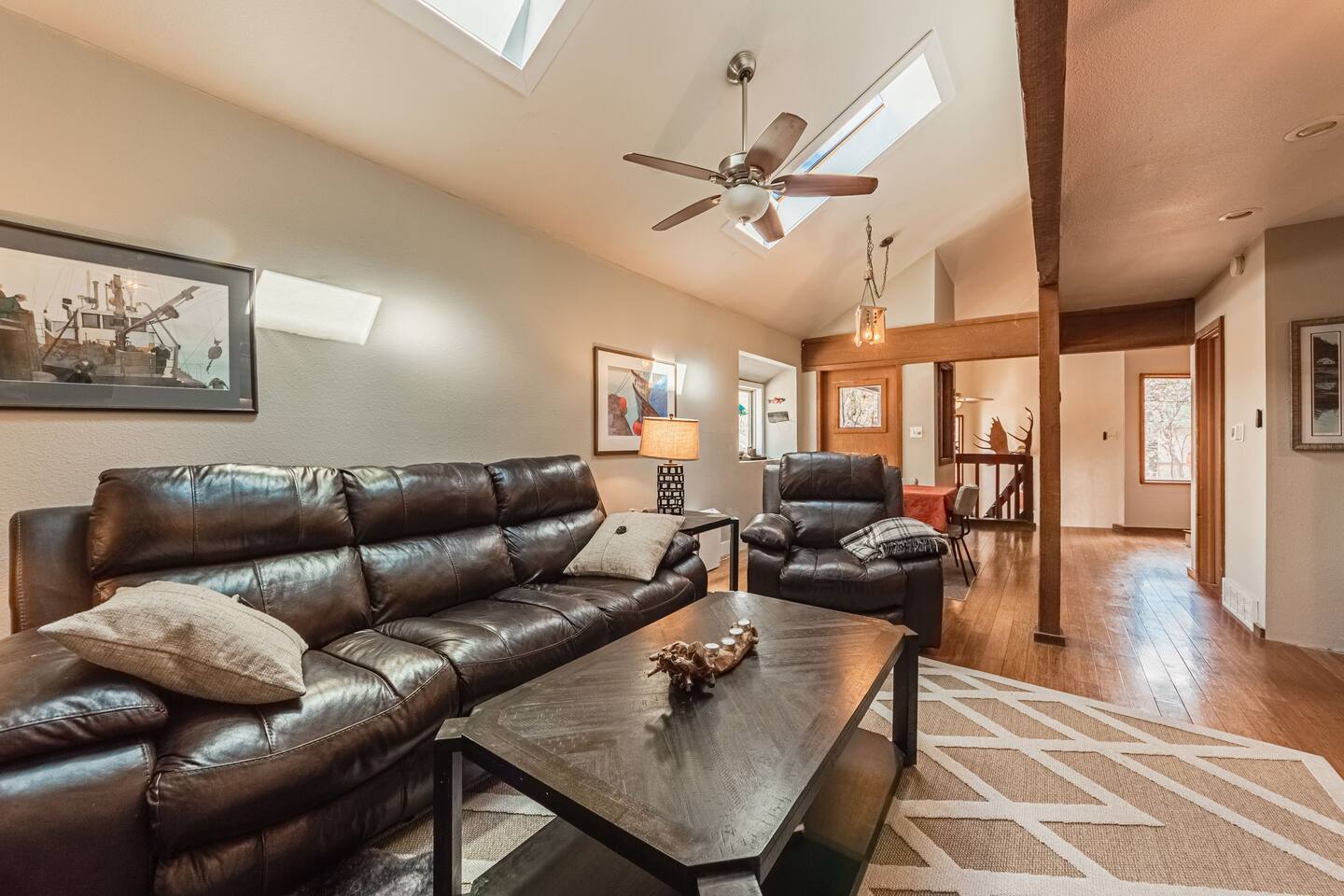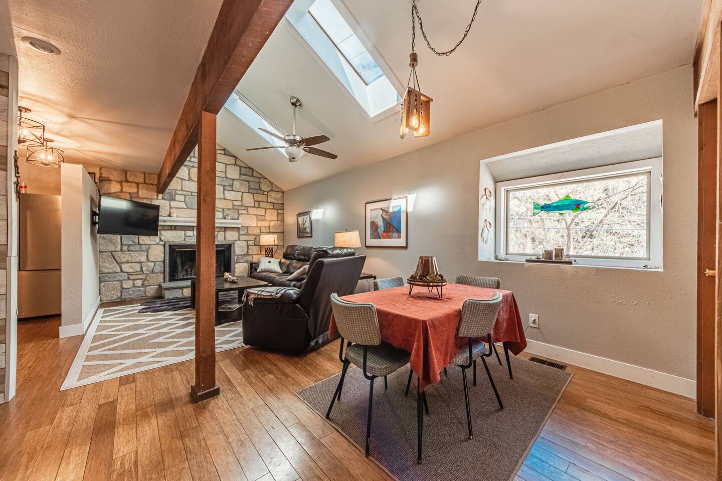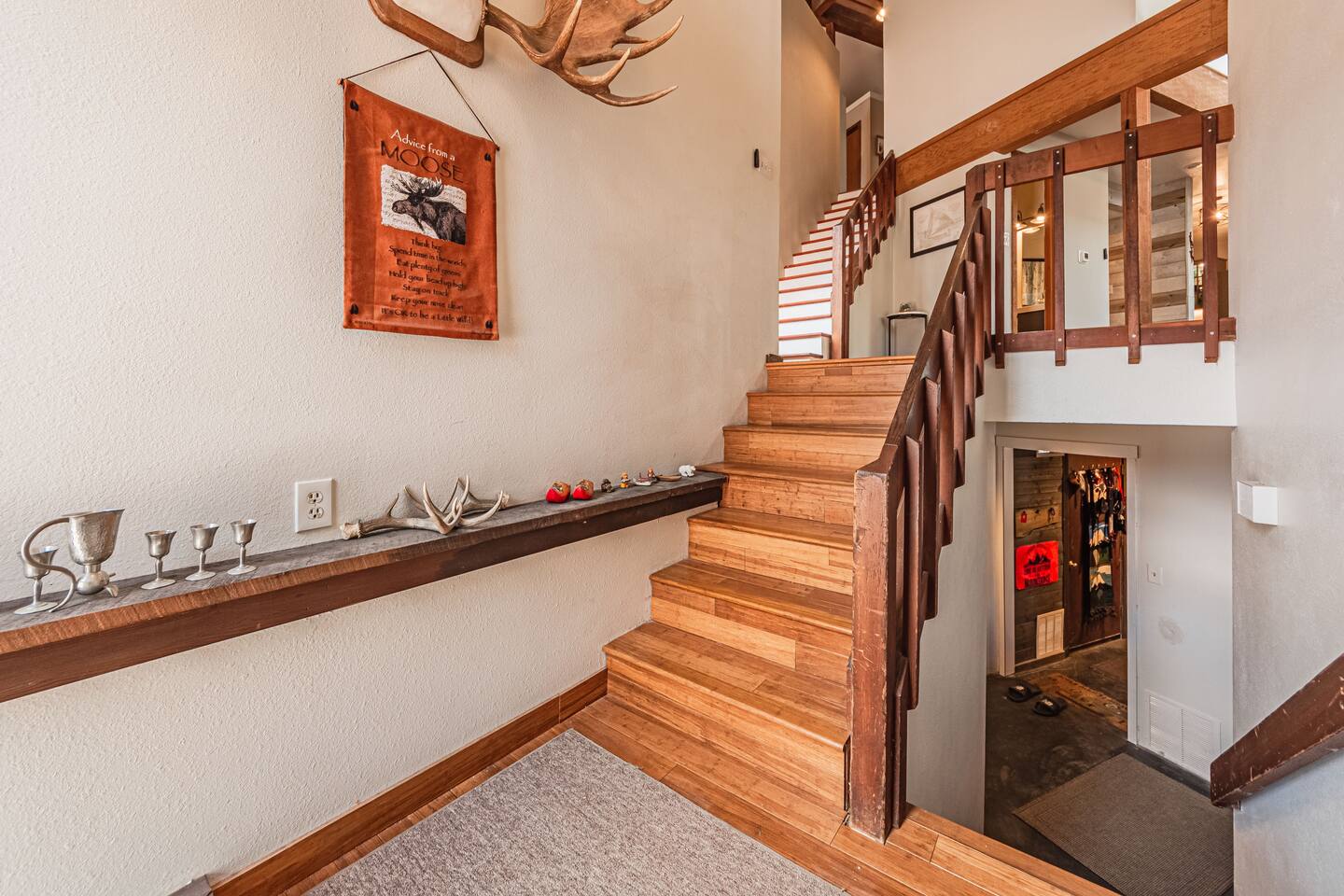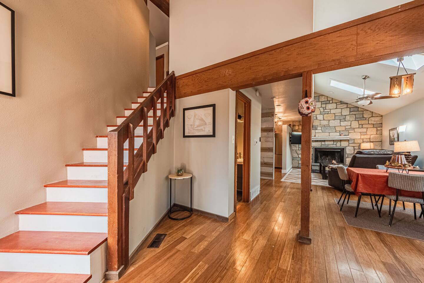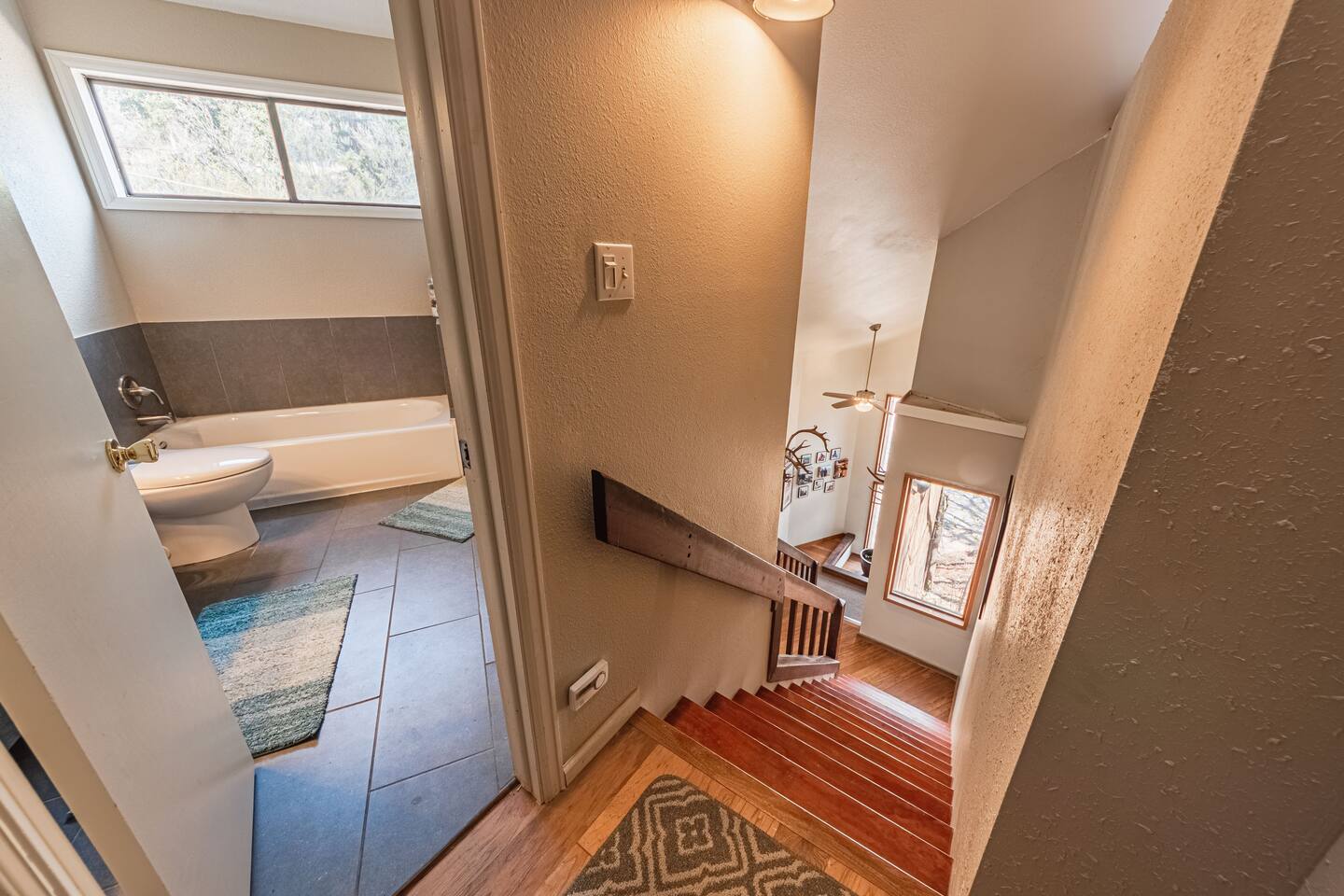 Entrance and garage on the ground floor. The second floor features an open kitchen and living area with a cozy fireplace, vaulted ceilings, skylights, and a patio with the relaxing sounds of the creek below. On the third floor, you will find the master suite and a loft area. From the master, acces the rooftop hot tub which is set against the Mountain, creating a naturally private space with serene views!