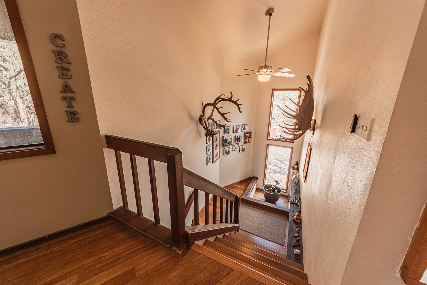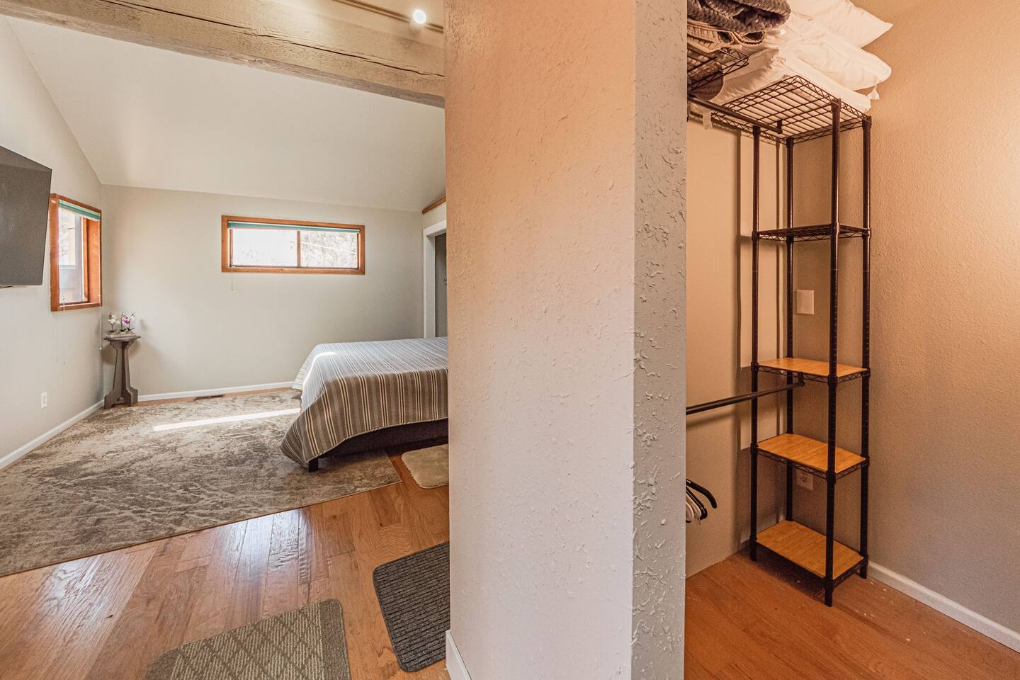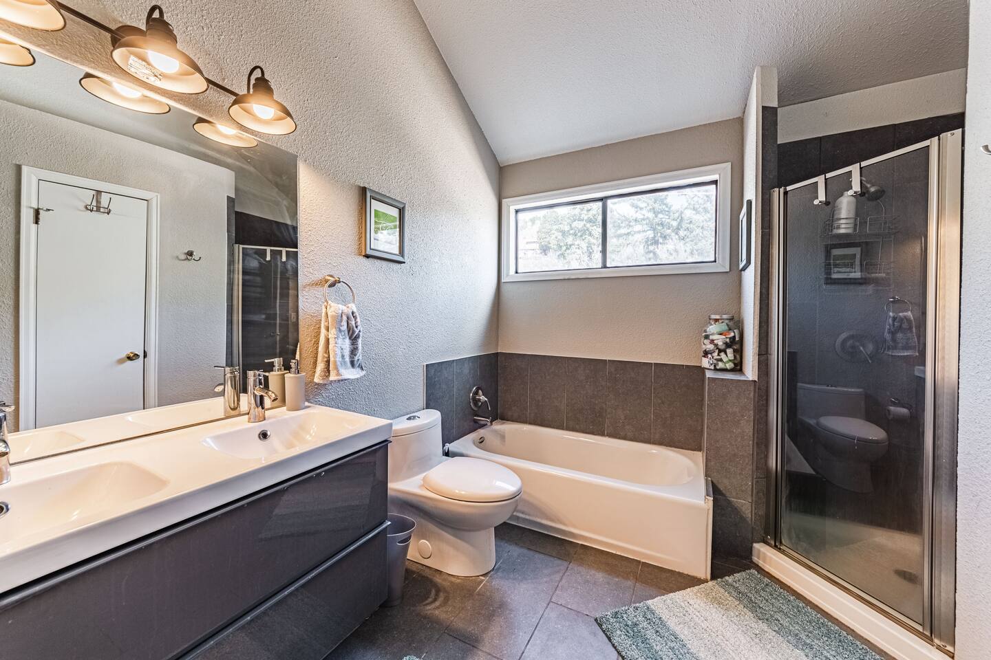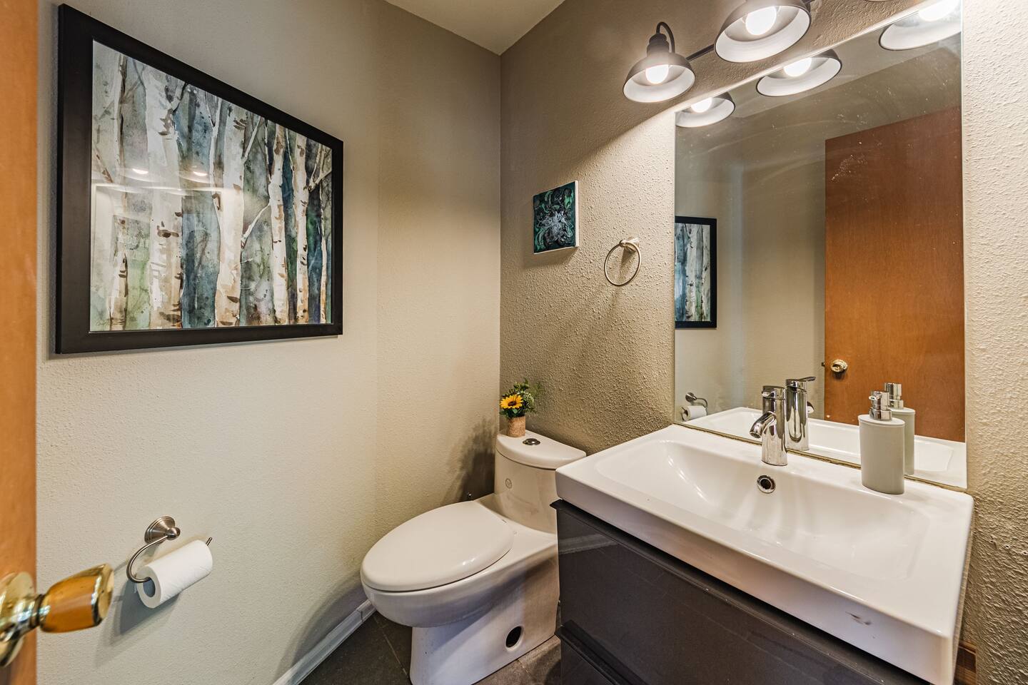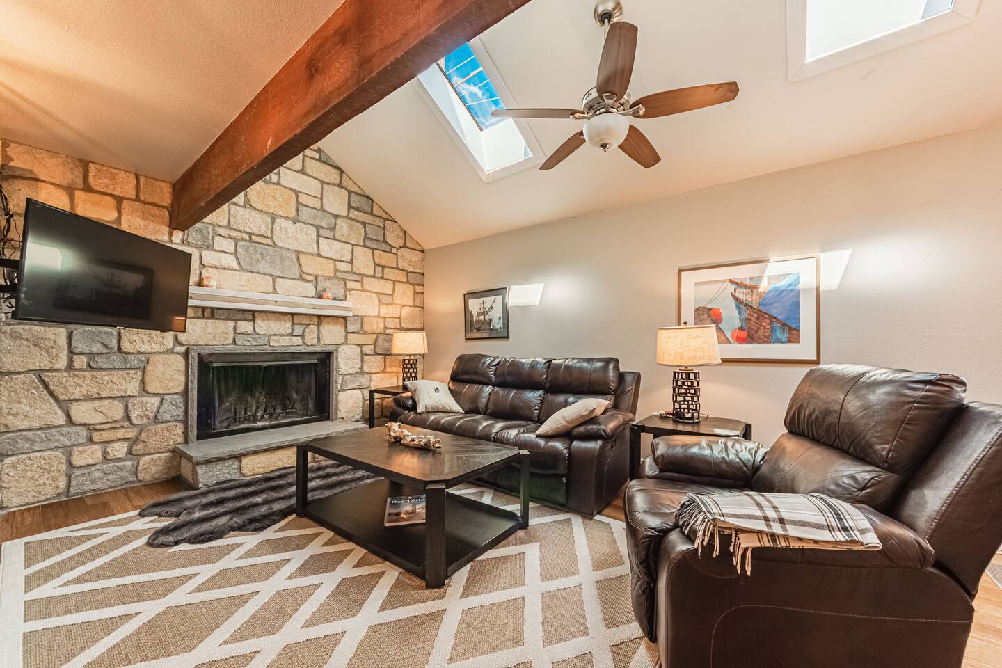 Entrance and garage on the ground floor. The second floor features an open kitchen and living area with a cozy fireplace, vaulted ceilings, skylights, and a patio with the relaxing sounds of the creek below. On the third floor, you will find the master suite and a loft area. From the master, acces the rooftop hot tub which is set against the Mountain, creating a naturally private space with serene views!